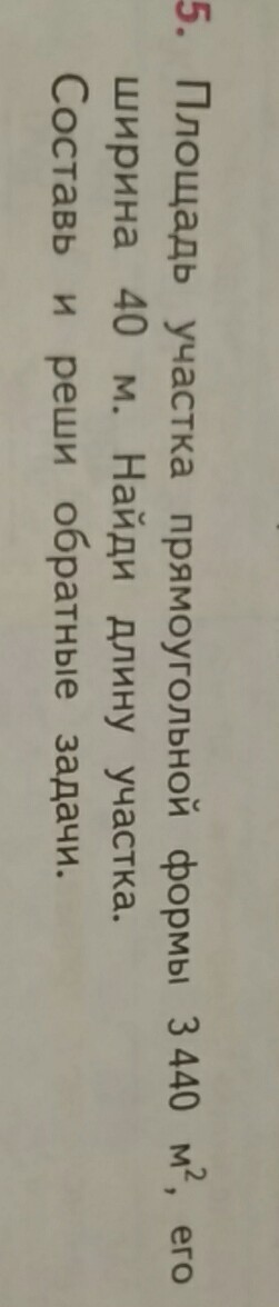 площадь участка прямоугольной формы 3440 метров в квадрате, его ширина 40 метров. Составь и реши обратную задачу