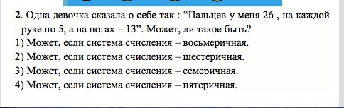 2. переведем 26 из семеричной системы в десятичную и получим 20 (количество пальцев на руках и ногах)