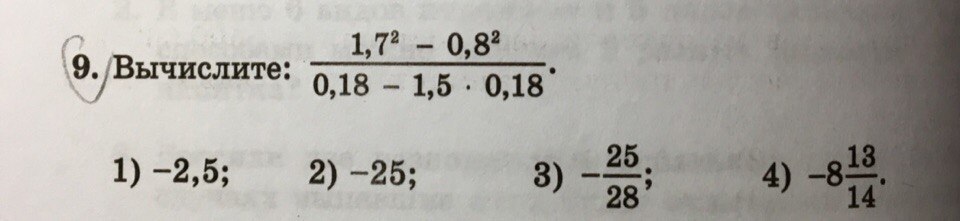 (1,7² - 0,8²)/(0,18 - 1,5•0,18) = (1,7 - 0,8)(1,7 + 0,8)/0,18•(1 - 1,5) = 0,9•2,5/(-0,18•0,5) = -9•25/1,8•5 = -25