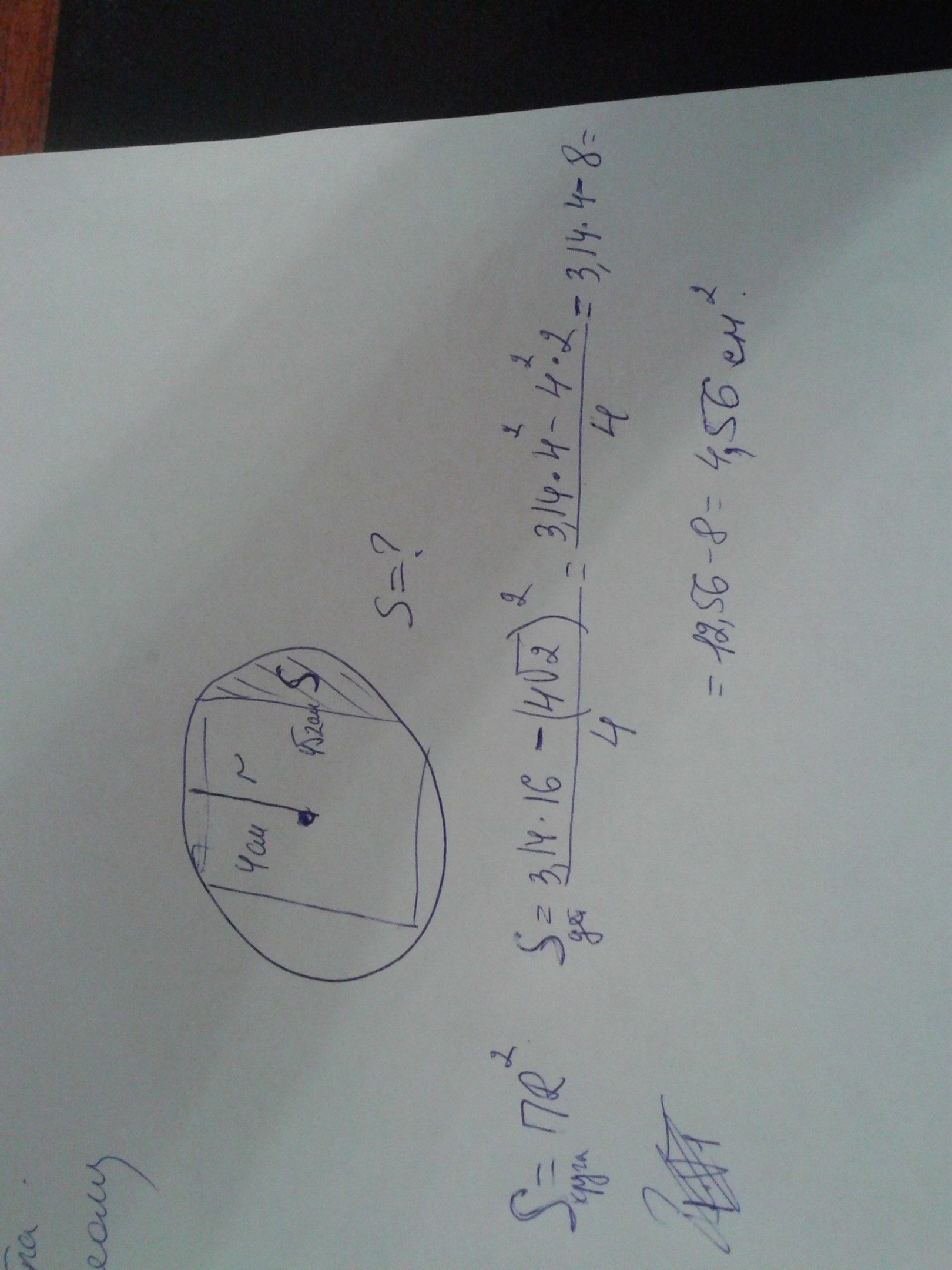 Для начала мы можем посчитать площадь всего круга - это => Sкр=пи на радиус в квадрате => 16 пи . Теперь представим, что в круге у нас находится квадрат стороной 4 корня из двух , отсекающий 4 сегмента круга. Теперь вычитаем площадь квадрата из площади круга и делим результат на 4. Вуаля.