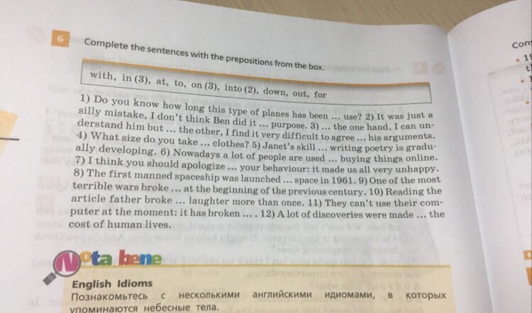 1 in 2 on 3 on, on, with 4 in 5 in 6 to 7 for 8 into 9 out 10 into 11 down 12 at