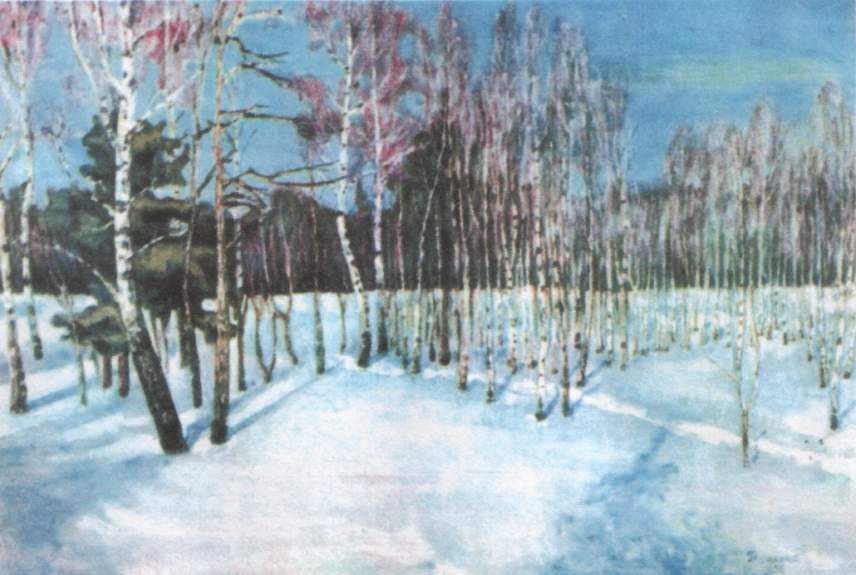 картына намальована дуже орегінально. Білий сніг покривае галявину, на якій ростуть тонкі берези, ялинки, на вулиці ще світлий день, небо блакитне. березоньки стоять у рожевому квіті, скидаючи останні листки, засинають на ході.