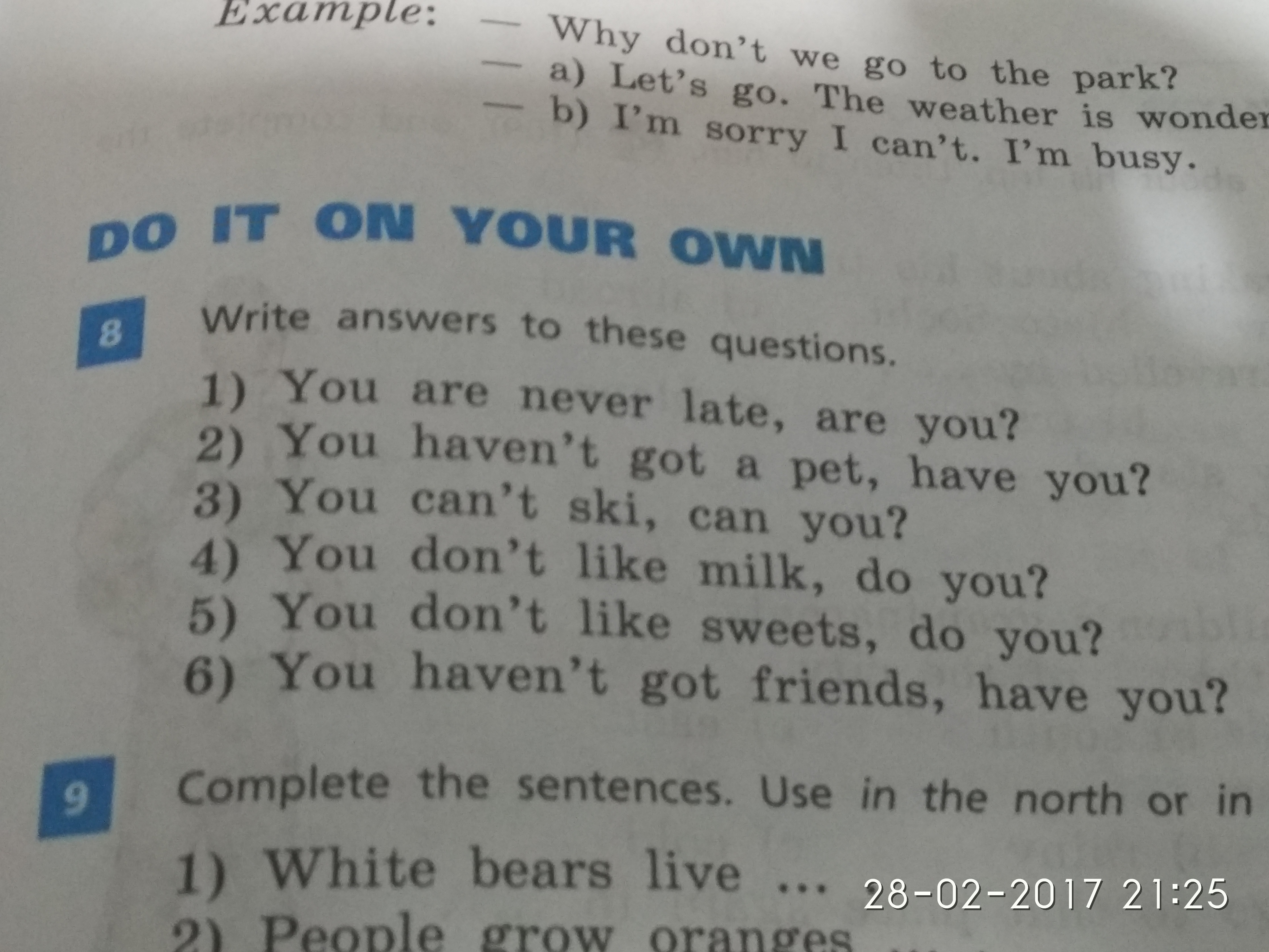 Вы никогда не опаздываете, не так ли?У вас нет питомца, не так ли?Вы не можете кататься на лыжах , не так ли?Вам не нравится молоко, не так ли?Вы не любите сладости, не так ли?Ты не имеешь друзей, не так ли?