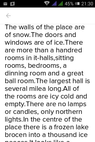 Стены место из снега.Двери и окна из льда.Есть более чем сто номеров в он-залы,гостиные, спальни, столовая и большой бальный зал.Самый большой зал в несколько milea долго.Во всех номерах есть холодная и пустая.Нет лампы или свечи, только Северное Сияние.В центре место есть замерзшее озеро brocen на тысячу кусманы льда.Это похоже на разбитое зеркало.В центре этого озера сидит Снежная Королева, когда она находится дома. Она называет озеро “зеркалом разума"и Сая это лучший и единственный в мире.