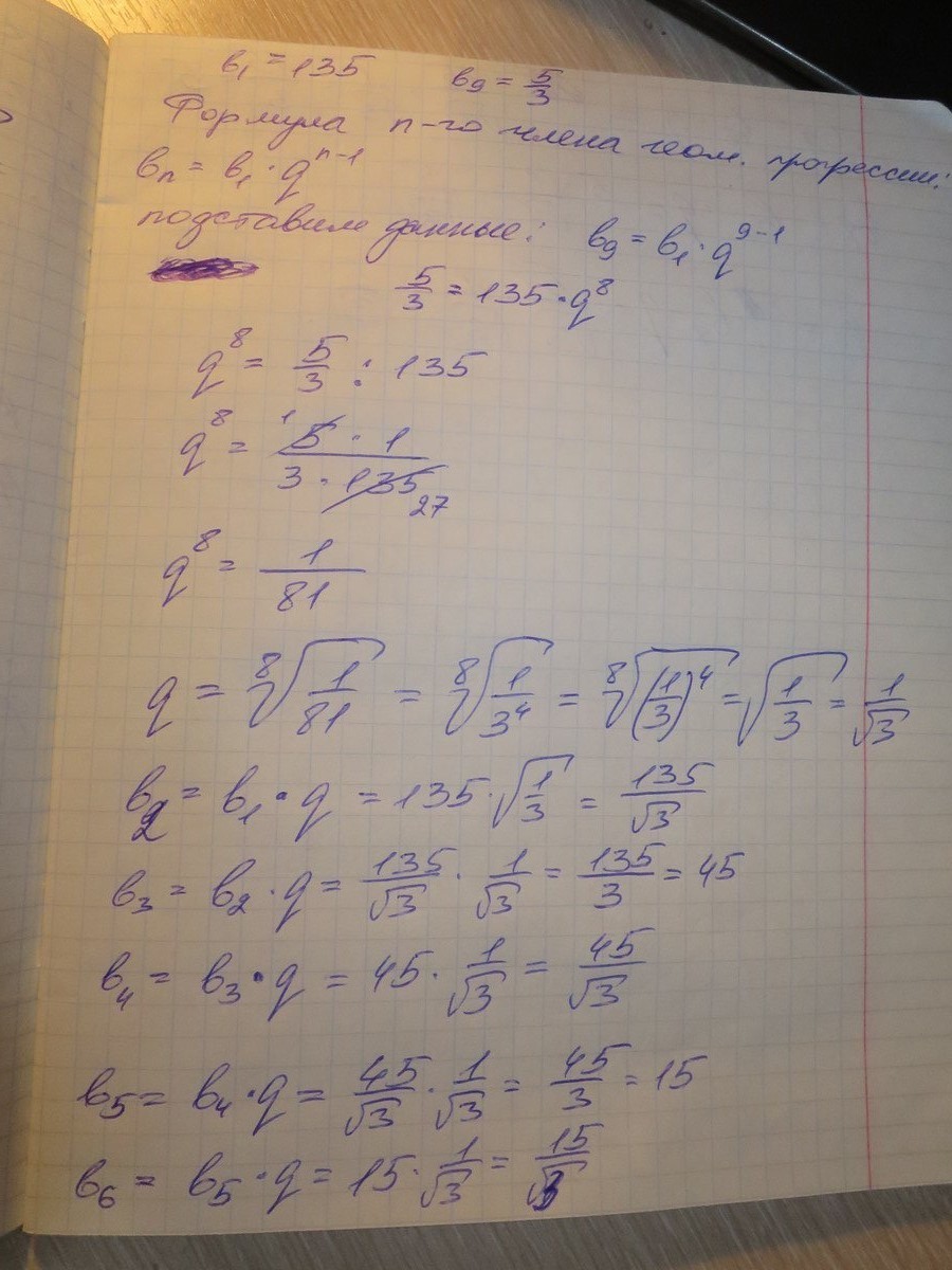 СРОЧНО !!!! Первый и девятый члены геометрической прогрессии равны соответственно 135 и 5/3. Найдите заключенные между ними члены этой прогрессии.
