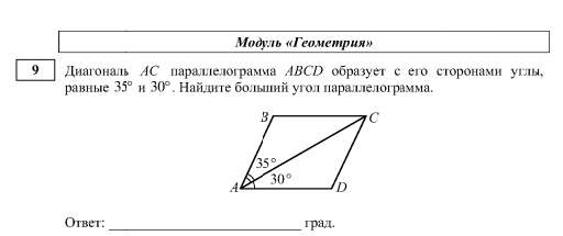 Диагональ AC параллелограмма ABCD образует с его сторонами углы, равные 35 и 30 градусам. Найдите больший угол параллелограмма