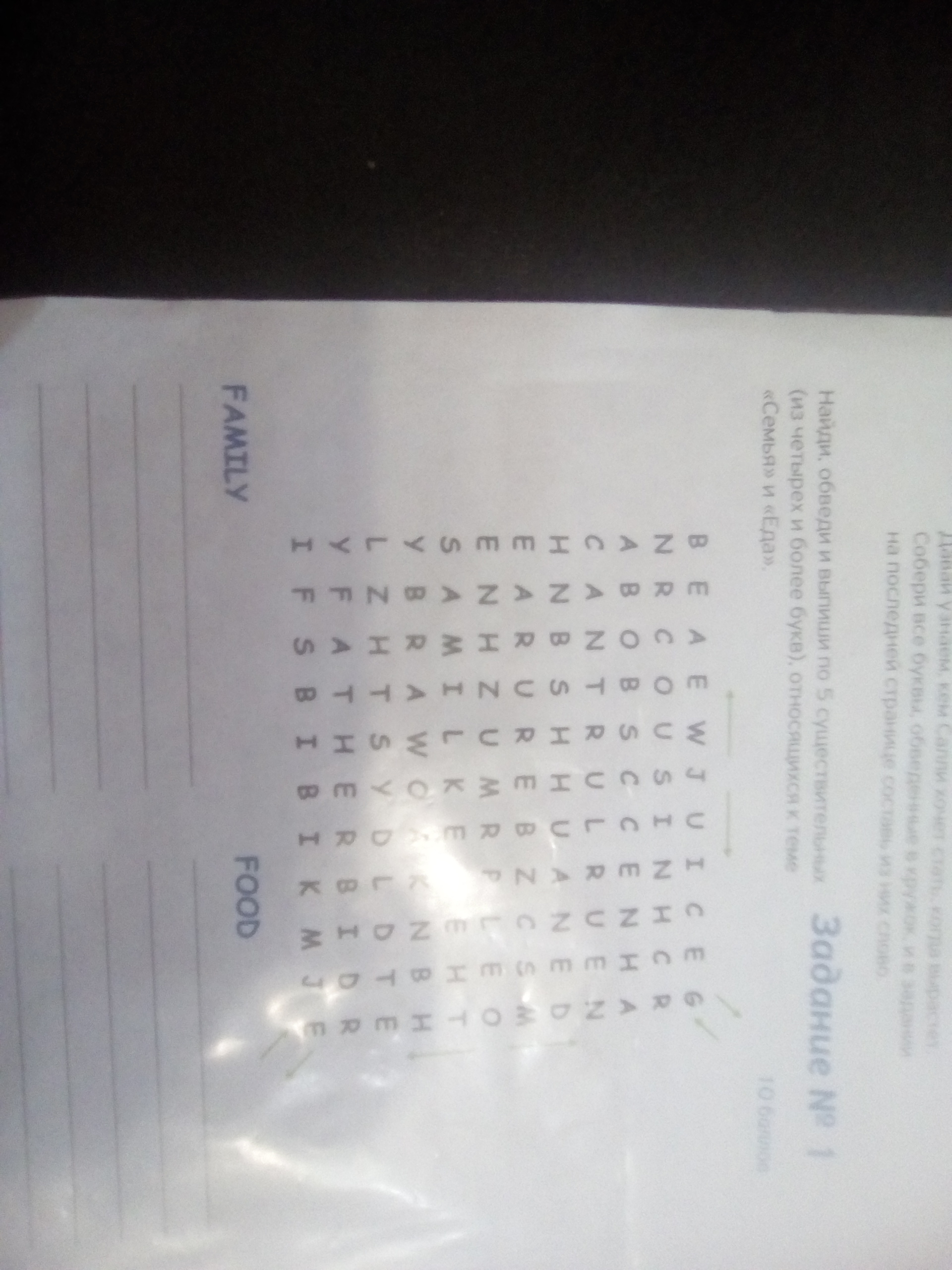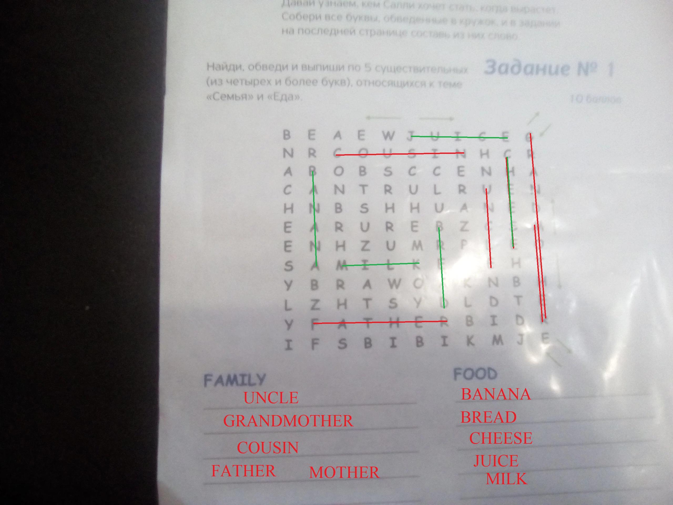 Найди обведи и выпиши по пять существительных из четырех и более букв относящихся к теме семья и еда