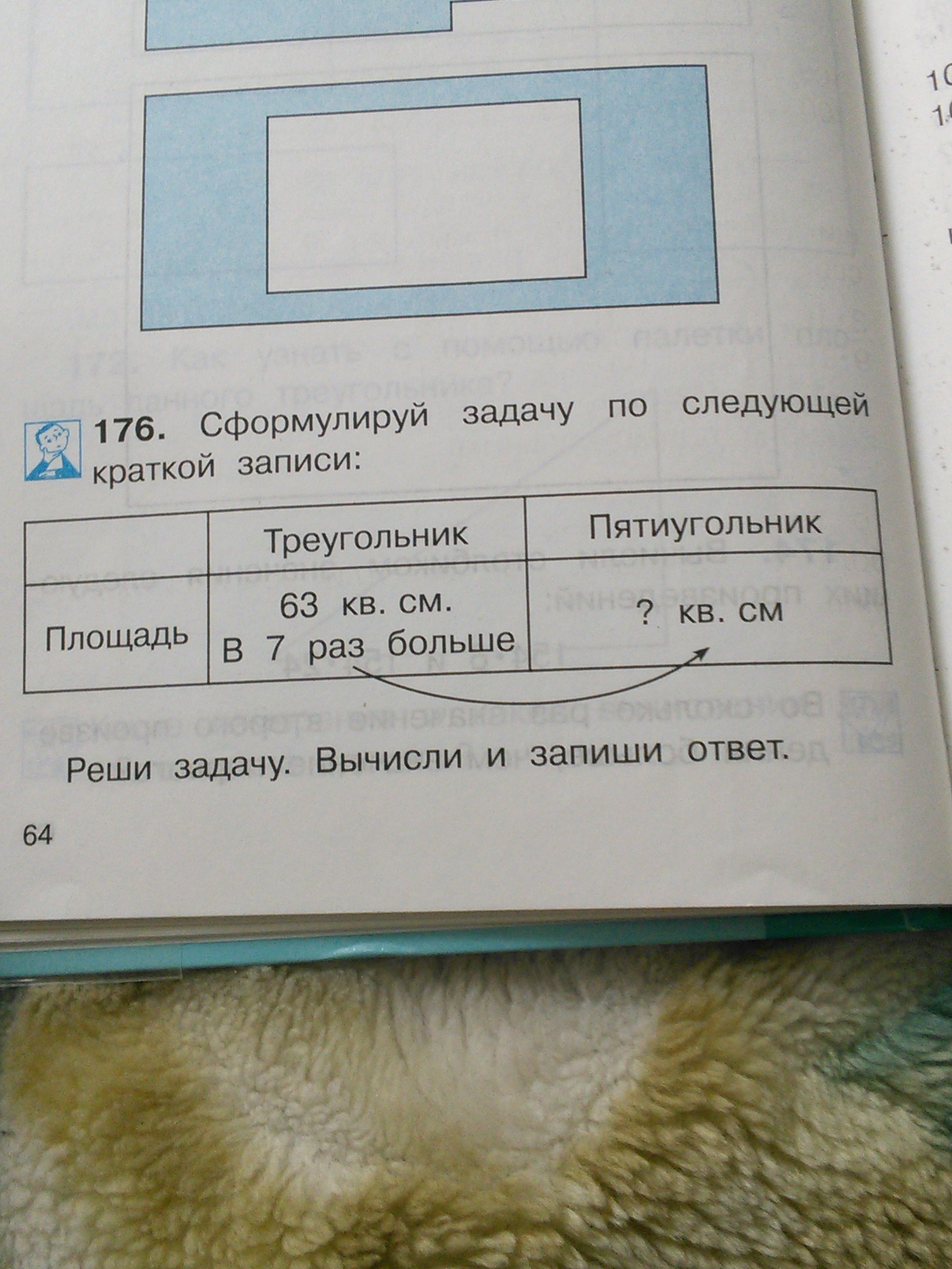 Площадь треугольника равна 63 кв. см. Чему равна площадь пятиугольна, если она в 7 раз больше площади треугольника.