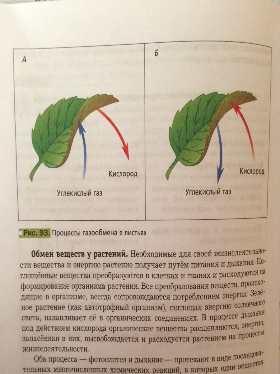 Внимательно рассмотрите рисунок 93. Определите, какой процесс показан на рисунке слева (A) и какой справа (Б) Сравните их и укажите самое существенное различие между изображенными процессами. Свои выводы запишите в рабочую тетрадь и представьте в виде СХЕМЫ процесс дыхания растения.