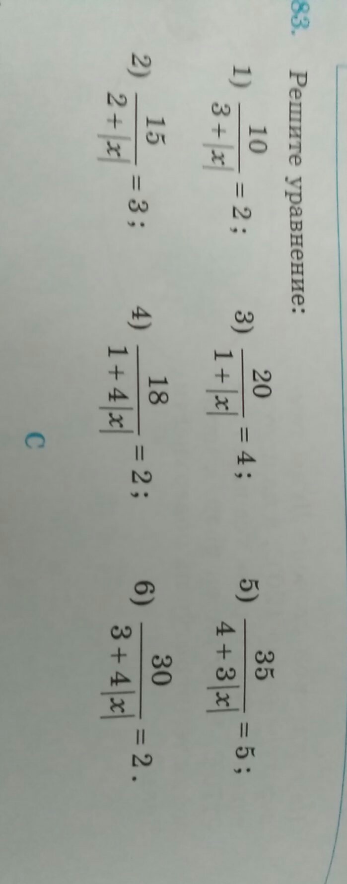 давление 1) 10/3+|х|=2; 2)15/2+|х|=3; 3)20/1+|х|=4; 4)18/1+4|х|=2; 5)35/4+3|х|=5; 6)30/3+4|х|=2.