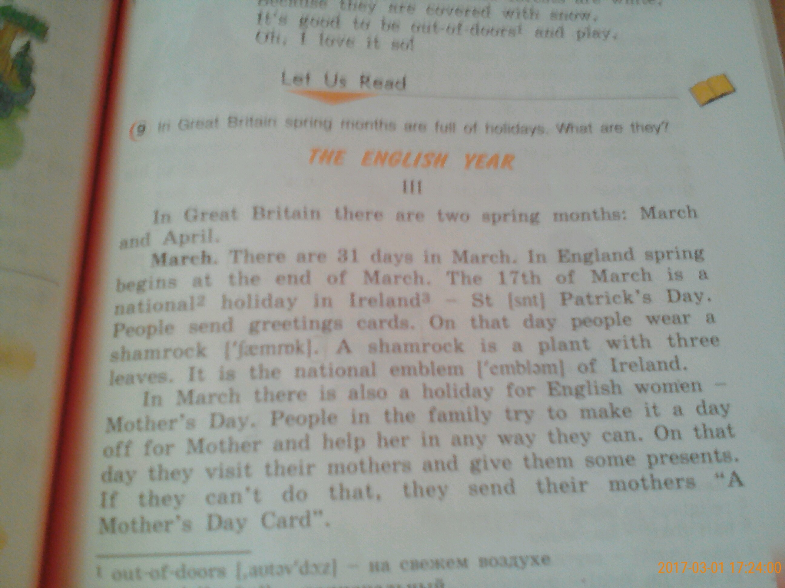 Март. В марте 31 день. В Англии весна начинается когда Март заканчивается. 17 марта национальный день Ирландии - День Святого Патрика. Люди посылают открытки. Люди одеваются в трилистники. Трилистники - растение с тремя листьями. Это национальная эмблема Ирландии.