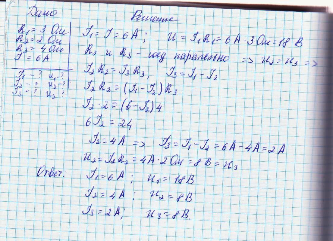 Найдите распределение сил токов и напряжений в цепи,если R1=3 Oм,R2=2 Ом, R3=4 Ом, а амперметр показывает 6 А