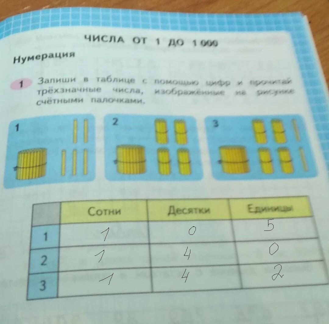 Запиши в таблице с помощью цифр и прочитай трехзначные числа изображённой на рисунке счетными палочками
