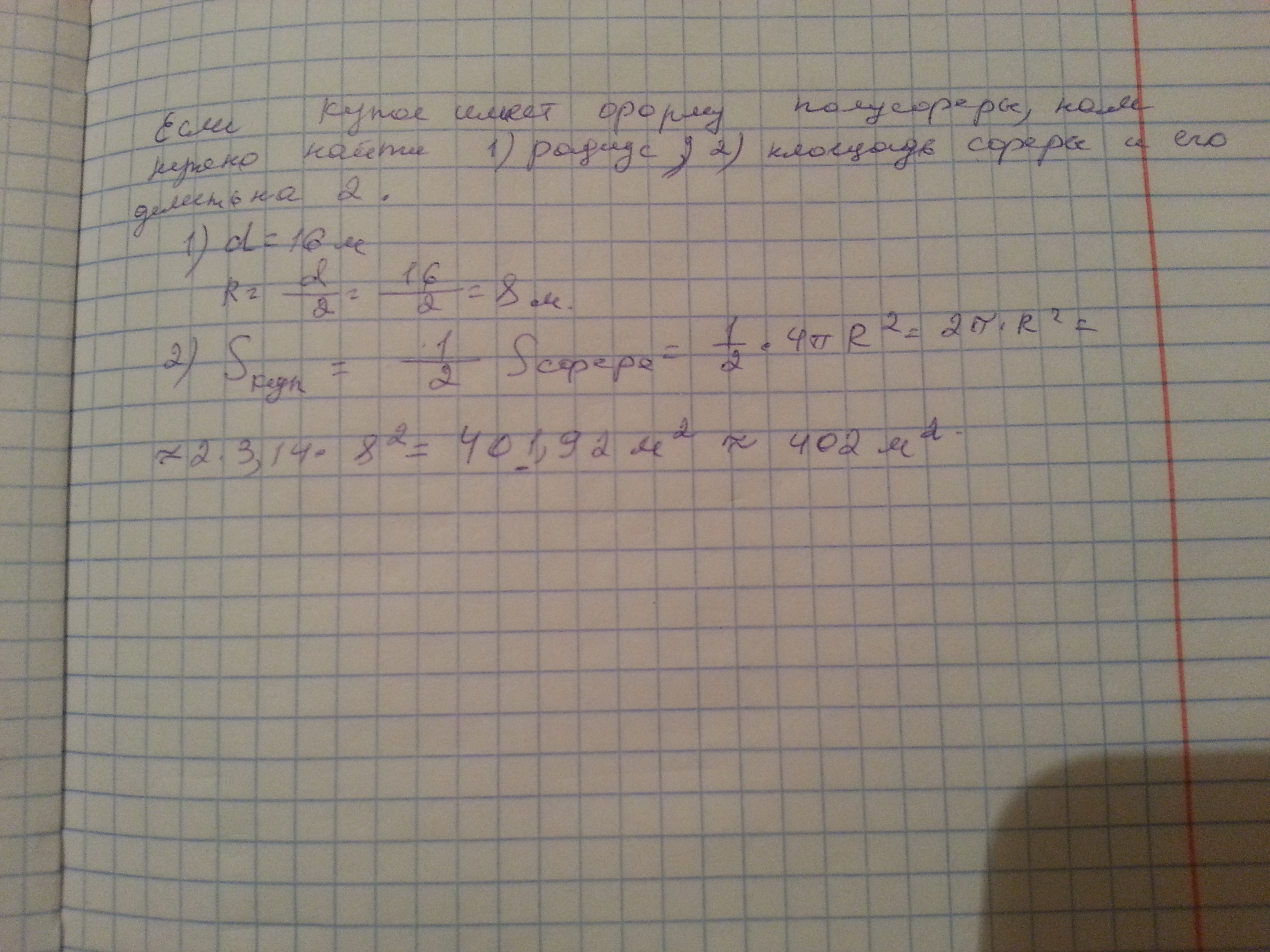 Новосибирский Планетарий имеет самый крупный за Уралом по величине диаметр купола звездного зала - 16 метров. Он имеет форму полусферы. Определите, сколько квадратных метров составляет максимальная площадь изображения звездного неба на куполе звездного зала, принимая π ≈ 3,14. Ответ округлите до целого числа.