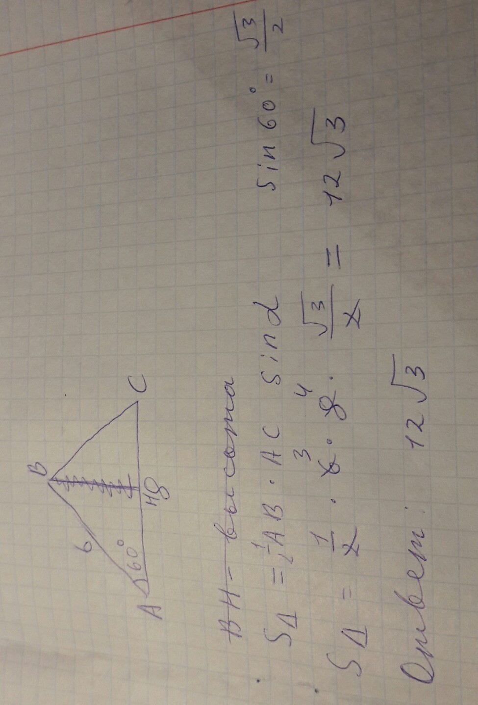 1.В треугольнике АВС АВ=6см.АС=8см,60градусов.Найдите площадь этого треугольника.