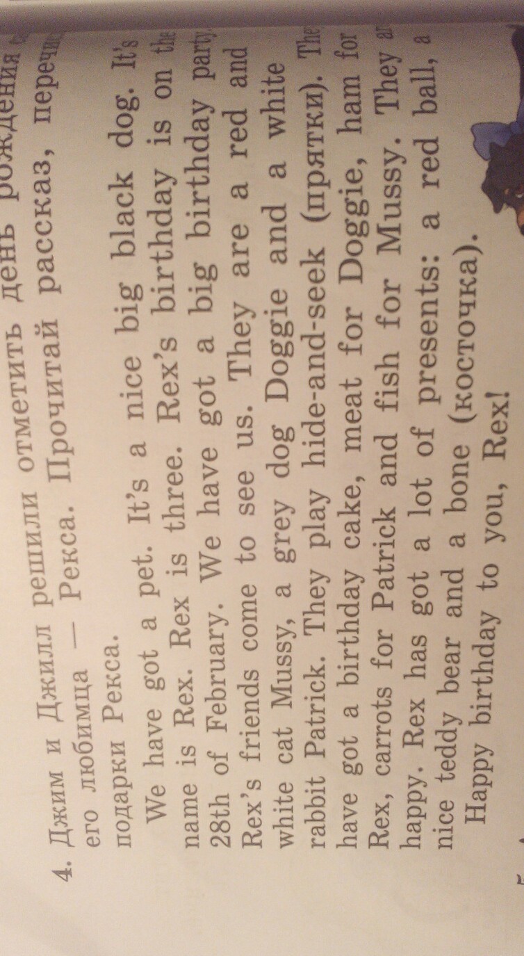 У нас есть домашнее животное. Это хороший большой черный пёс. Его зовут Рекс. Ему 3 года. День рождения Рекса 28 февраля. У нас была огромная вечеринка на день рождения. Друзья Рекса пришли посмотреть на нас. Там быфла рыже-белая кашка Мусси, серый пёс Догги и белый кролик Патрик. Они играли в прятки. Они ели праздничный торт, мясо для Догги, ветчина для Рекса, морковь для Патрика и рыба для Мусси. Они все счастливы. Рексу подарили много подарков: красный мячик, плюшевого мишку и косточку. С днем рождения, Рекс