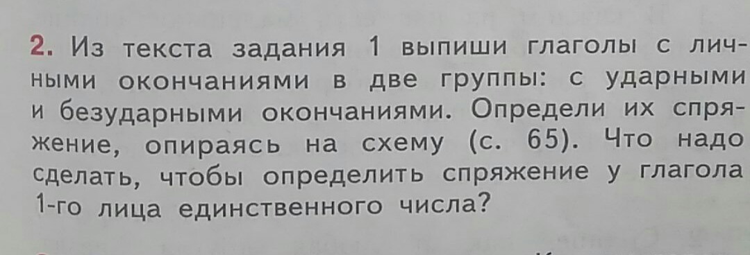 из текста задания 1 выпиши глаголы с личными окончаниями в две группы с ударными и безударными окончаниями определи спряжение опираясь на схему страница 65 Что надо сделать чтобы определить спряжение у глагола 1 лица единственного числа