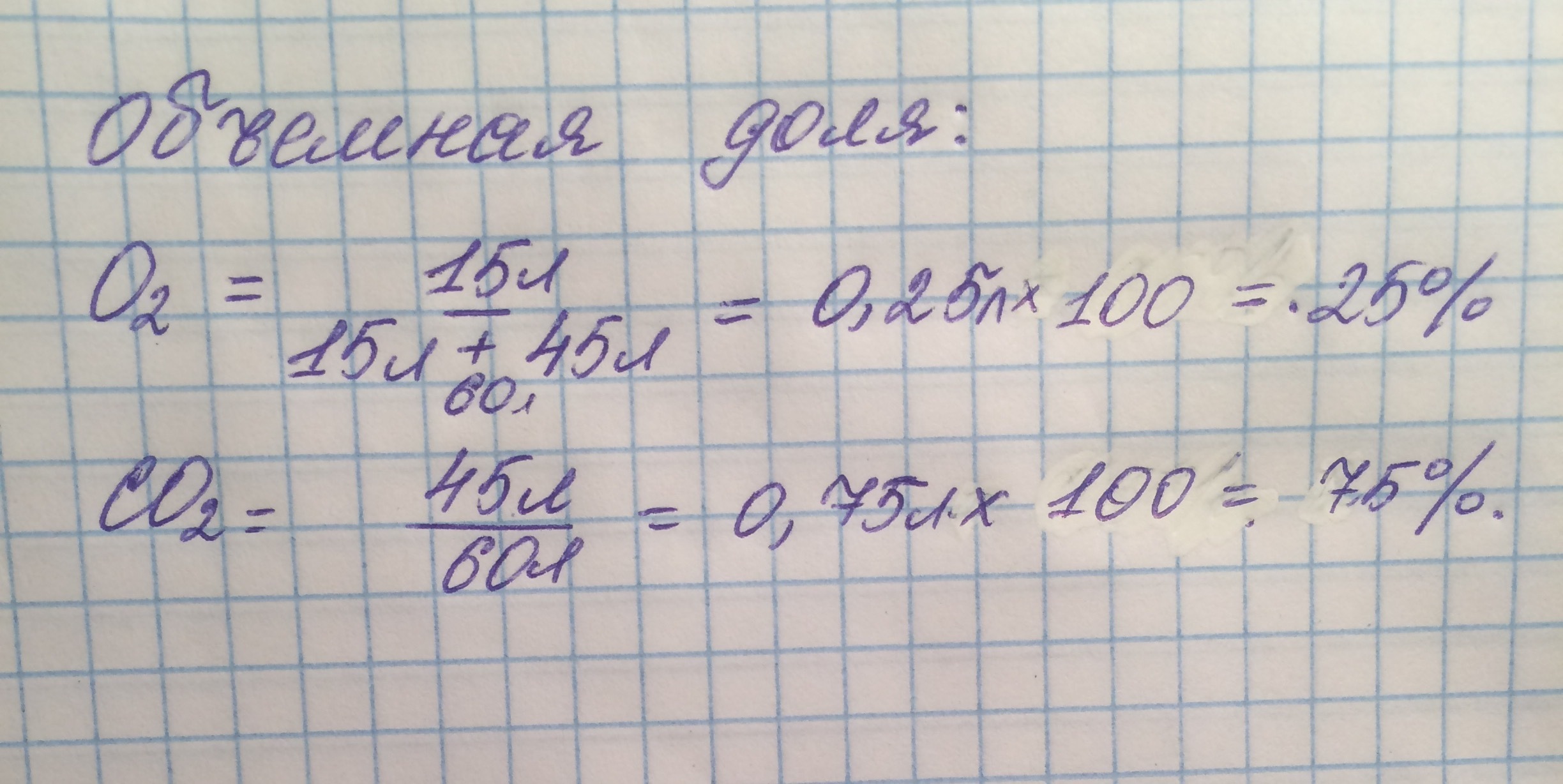 Смешали 15л кислорода и 45 л углекислого газа. Найдите объёмную долю каждого газа в полученной смеси.
