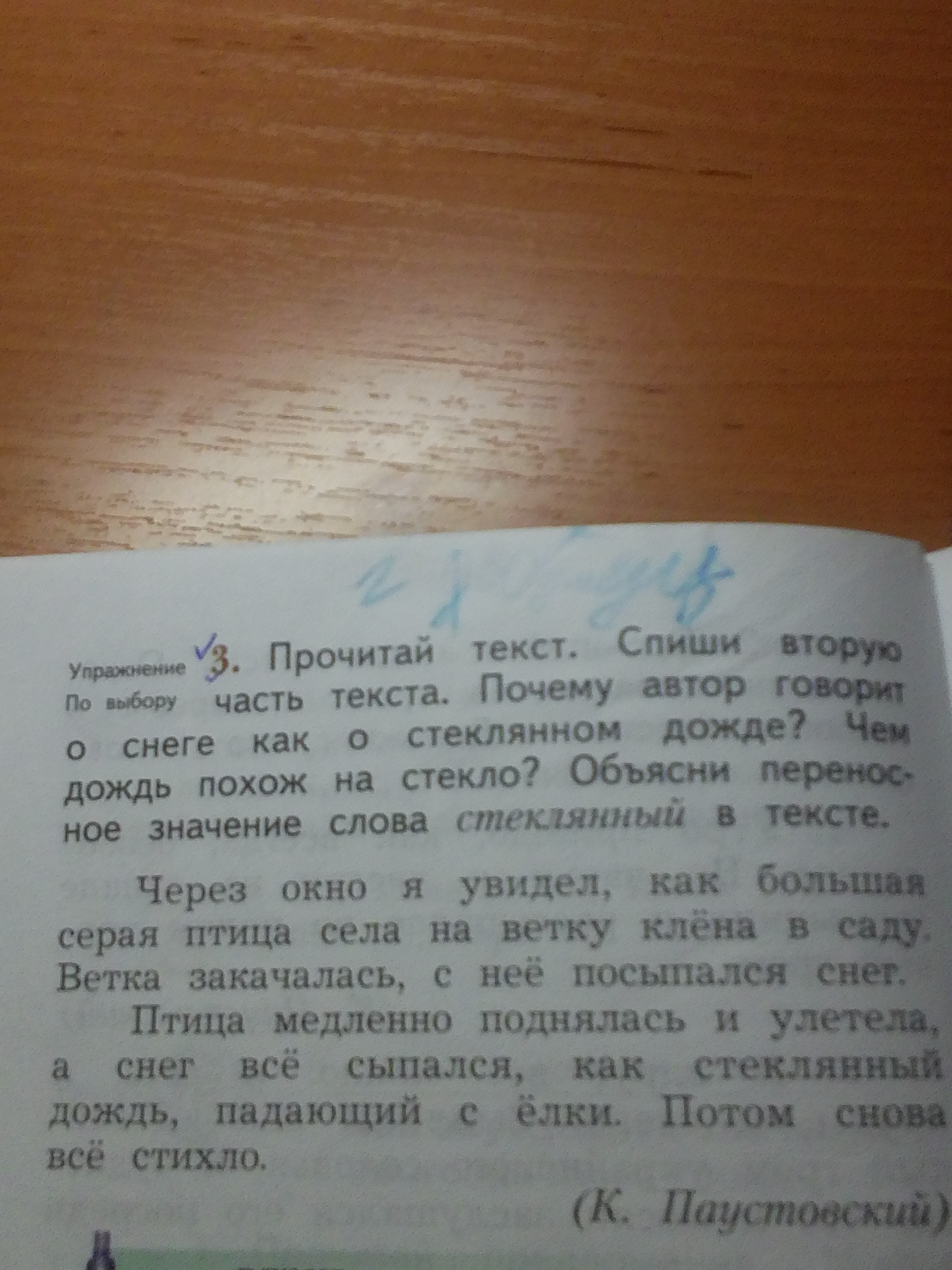 Прочитай текст. Спиши вторую часть текста.Почему автор говорит о снеге как о стеклянном дожде? Чем дождь похож на стекло? Обьясни переносное значение слова стеклянный в тексте.