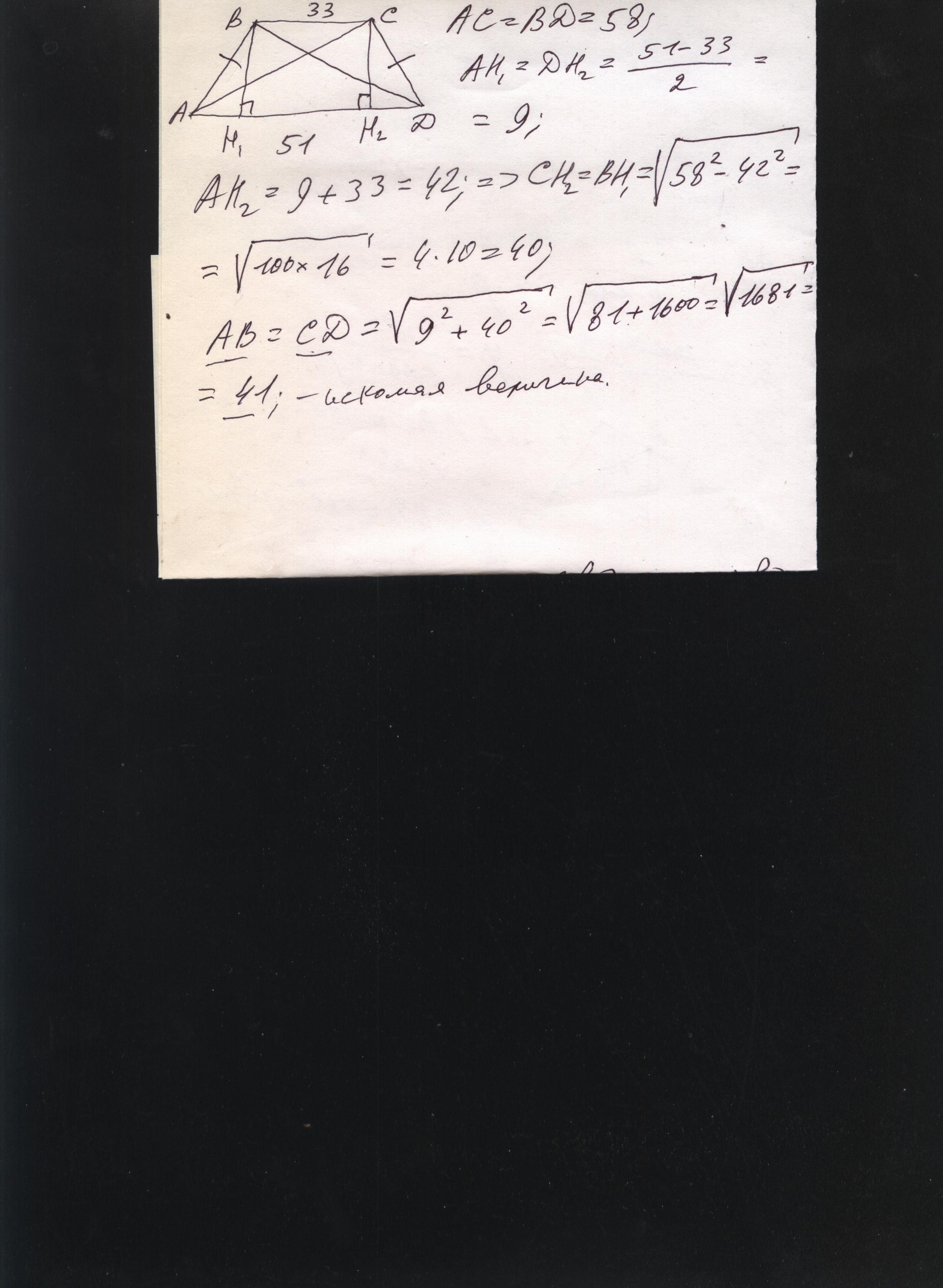 основания равнобокой трапеции равны 33 см и 51 см , а ее диагональ 58 см.Найдите боковую сторону трапеции
