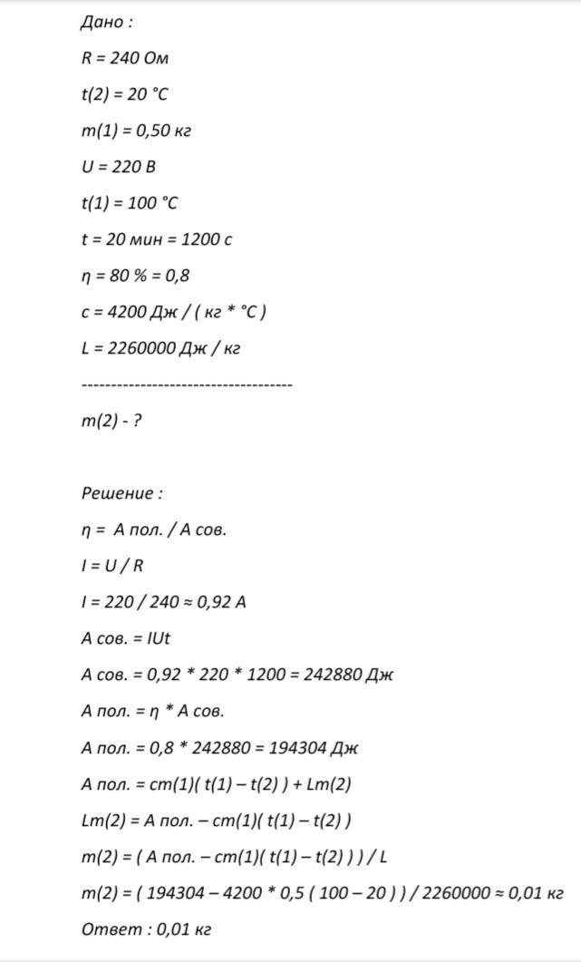 Нагреватель со спиралью сопротивлением R=240 Ом поместили в сосуд с водой при температуре t=20 °С, масса которой m1=0,50 кг, и включили в сеть напряжением U=220 В. Какая масса воды вскипит (достигнет температуры 100 °C) промежуток времени t=20 мн, если КПД спирали n=80%?