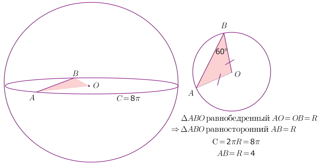 Точки A и B принадлежат большой окружности сферы, центром которой является точка O. Известно, что угол ABО 60 градусов, а длина окружности 8π см. Вычислите длину отрезка АВ.