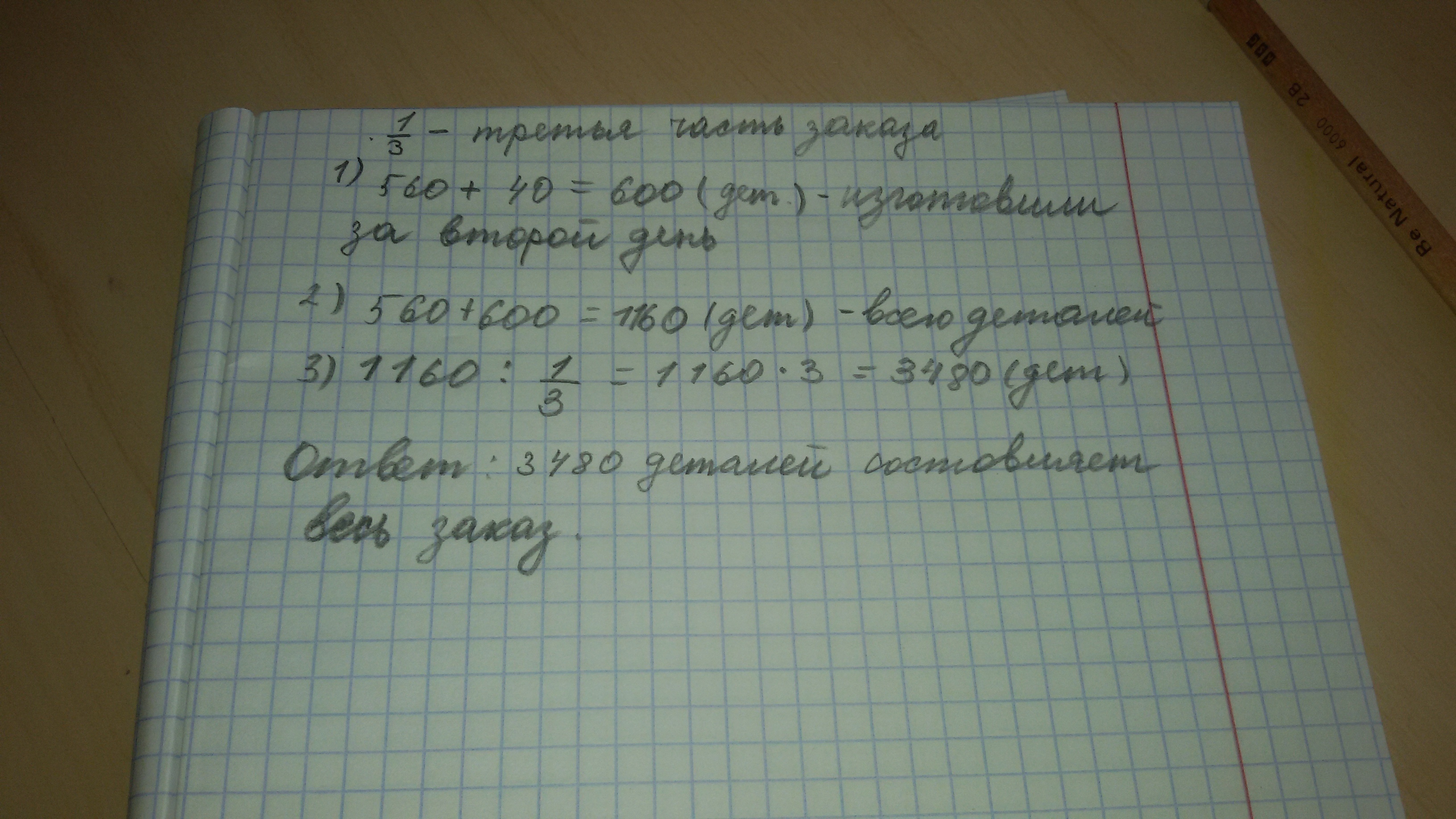 первый день на заводе изготовили 560 деталей, а за второй- на 40деталей больше. Количество деталей,изготовленных за эти два дня, составляет третью часть всего заказа. сколько деталей составляет весь заказ?