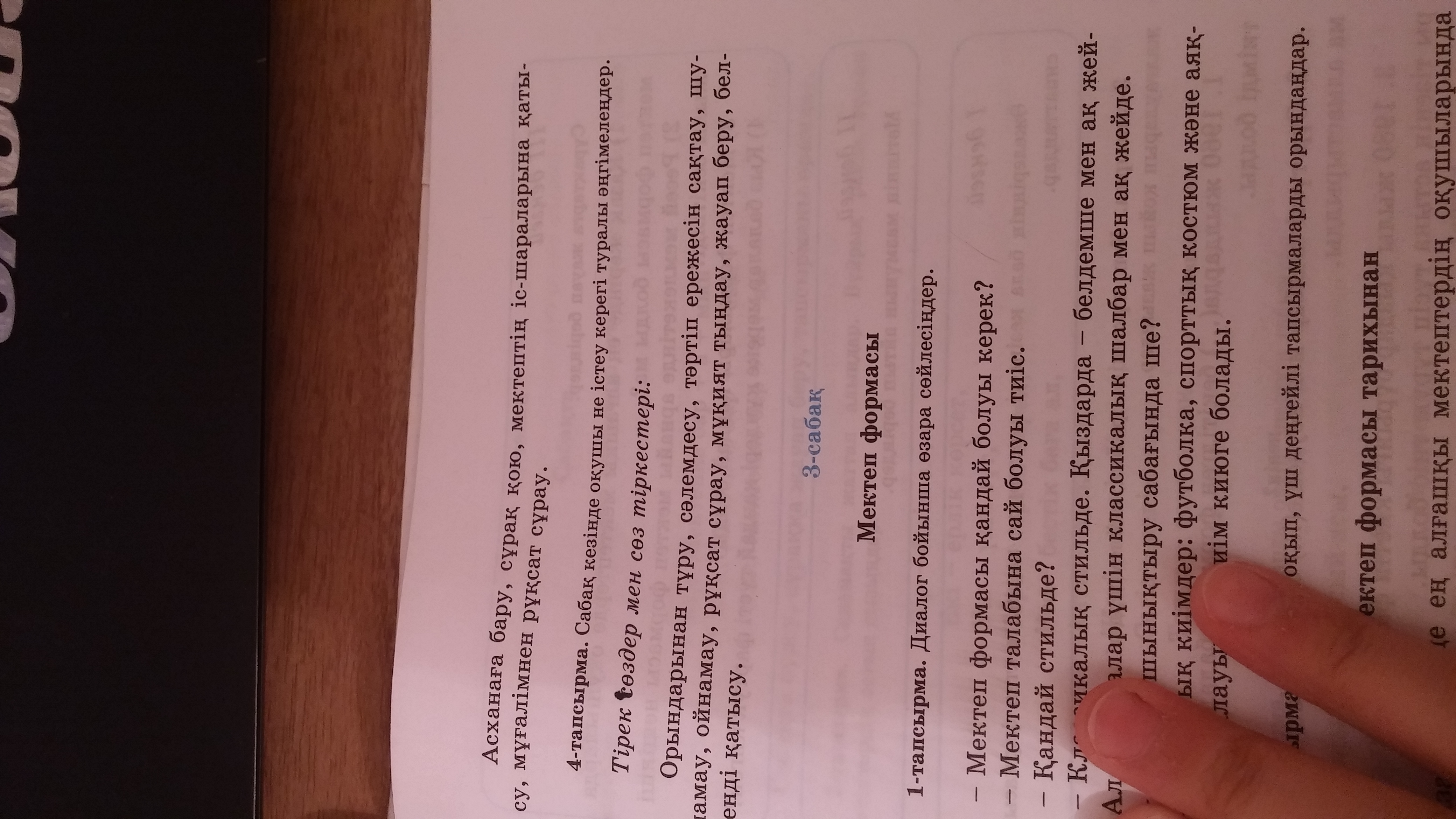4 тапсырма Мұғалім сыныпқа кыргенде оқушылар орындарынан тұру керек. Мұғалыммен бірінші рет бетпе бет көріскенде сәлемдесу керек. Сабақтың ішінде оқушы тәртіп ережесін сақтау керек. Мұғалым сабақ түсіндіргенде оқушылар шуламау тиіс. Мектептің затымен ойнамау керек. Оқушы шығу үшін рұқсат алу керек. Сабақ түсіндіріп жатқанда оқушы мұқият тындау керек. Мұғалім сұрақ койғанда, әрбір оқушы жауабын беру керек.Топтық сабақтарда белсенді қатысу керек