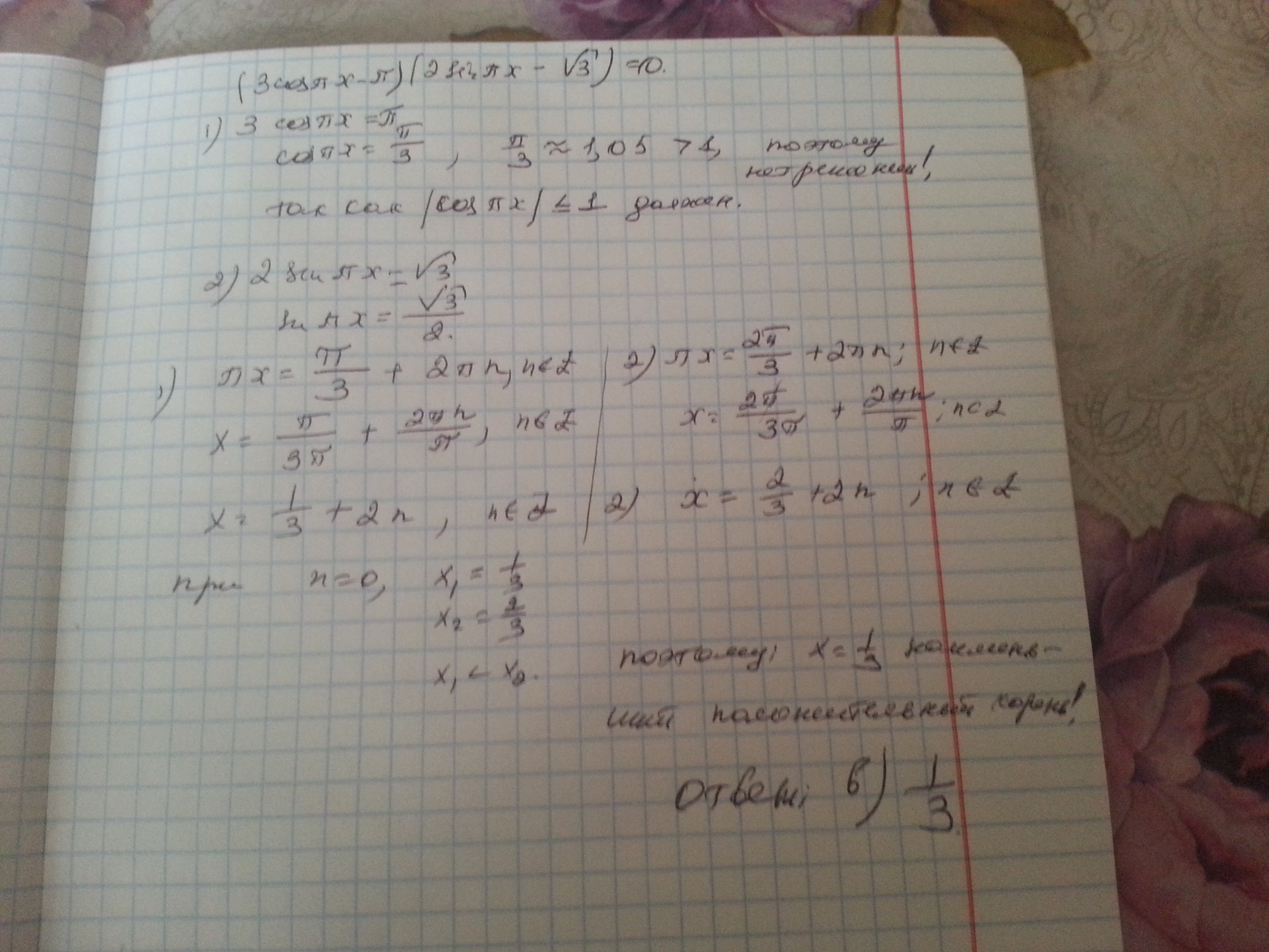 (3 cos пx - п)*(2 sin пx - корень из 3 ) = 0.