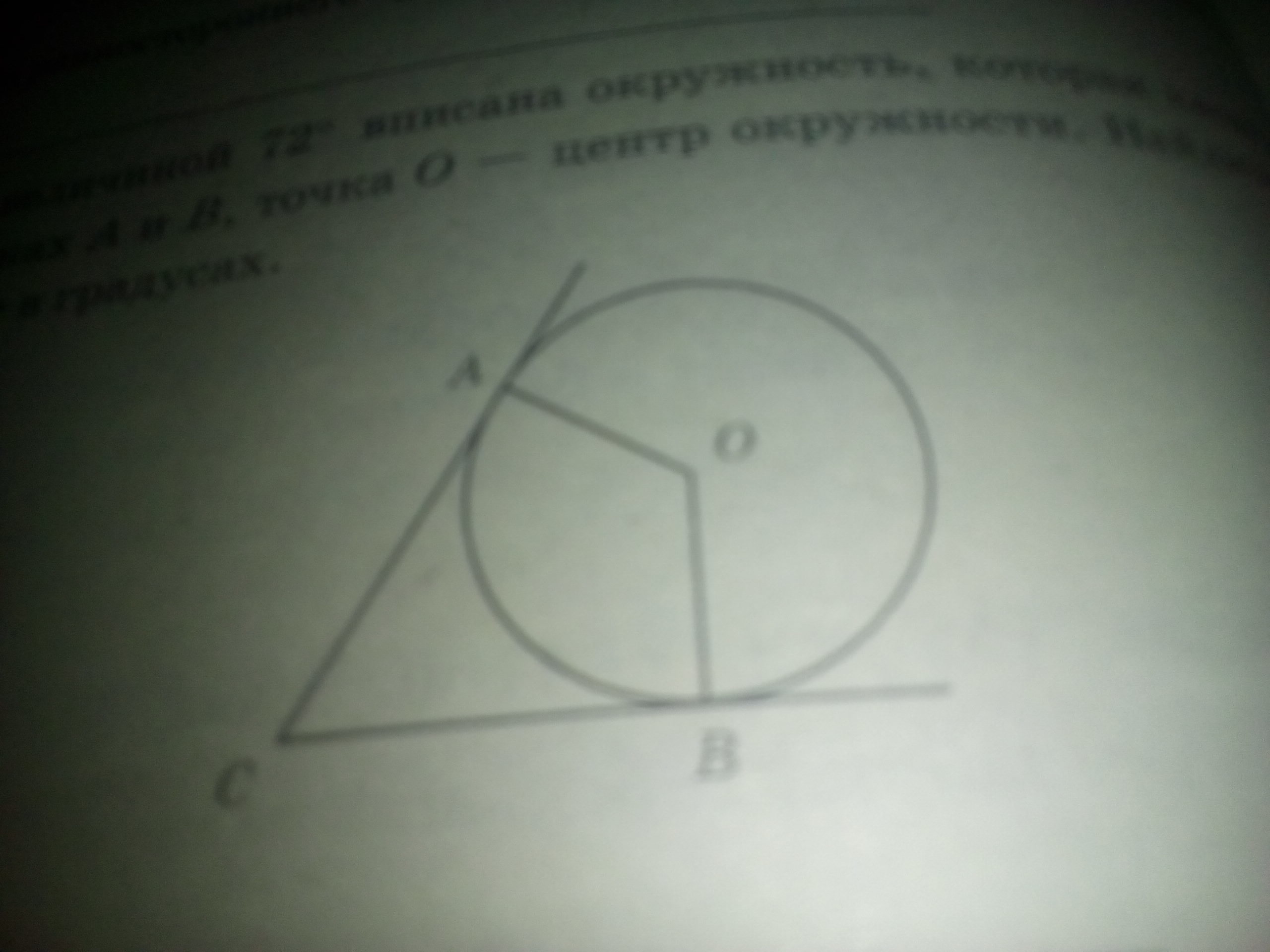В угол С величиной 72° вписана окружность которая касается сторон угла в точках А и В точка О - центр окружности. Найдите угол АОВ. Ответ дайте в градусах.