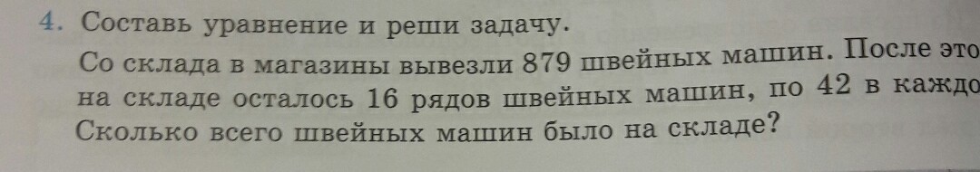 со склада в магазин привезли 879 швейных машин последа на складе осталось 16 видов швейных машин по 42 в каждом Сколько всего швейных машин было на складе