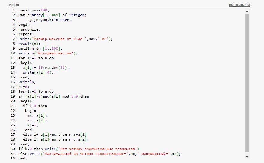 print('Максимальный из четных положительных =', max(b), 'минимальный =', min(b))