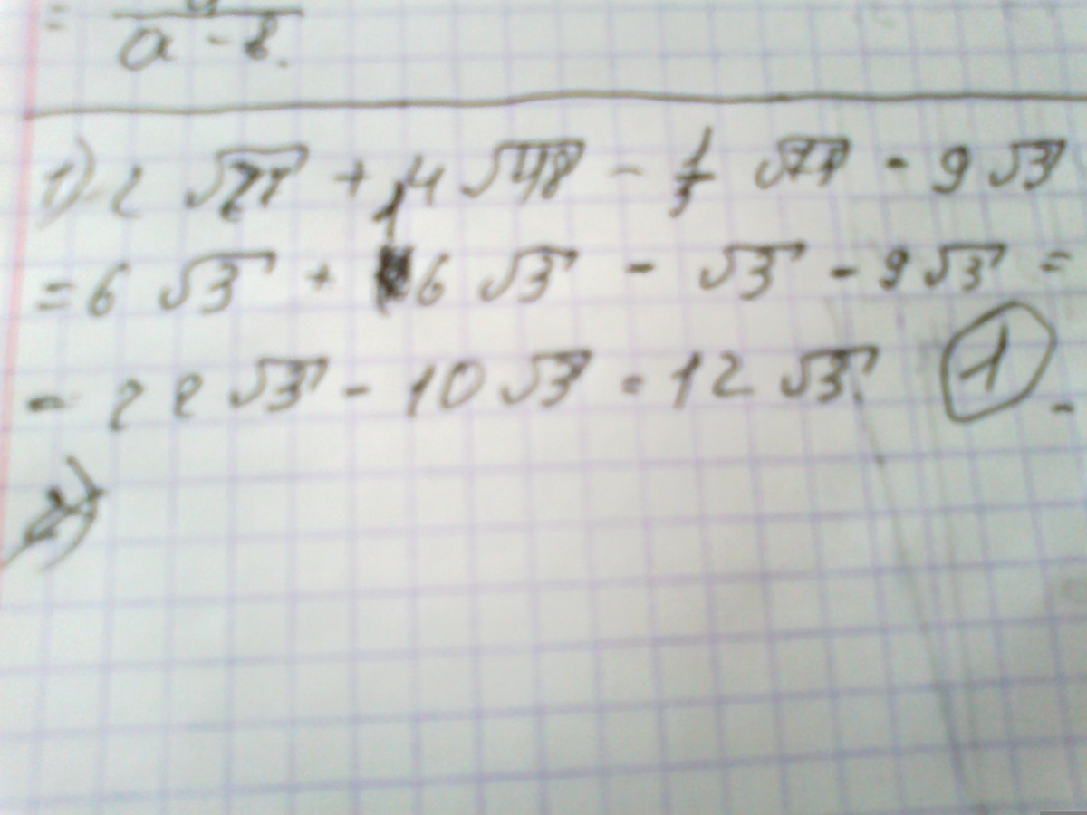 Вынесите множитель из-под знака радикала и упростите выражение 2√27+4√48- 1/5√75-9√3 1)12√3 2)10√3 3)-√3 4)2√3