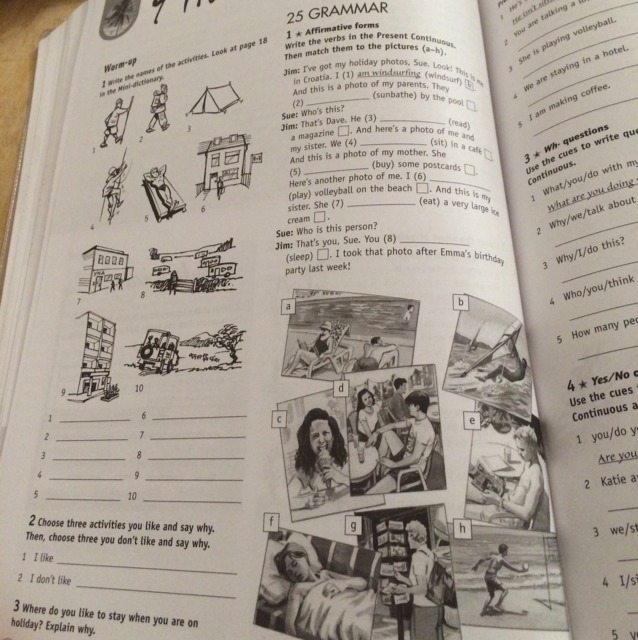 25 grammar там где вставлять пропущенные слова:2) are sunbathing,3)is reading,4)are sitting.5)is buying.6)am playing.7)is eating .8)are sleeping