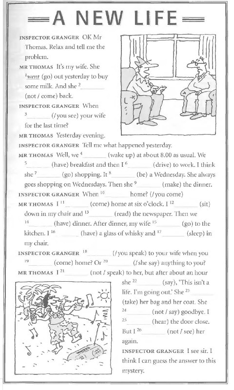 2) didn't come. 3) did you see. 4) woke up. 5) had. 6) drove. 7) went. 8) was. 9) made. 10) did you come. 11) came. 12) sat. 13) read. 14) had. 15) went. 16) had. 17) slept. 18) did you speak. 19) came. 20) did she say. 21) didn't speak. 22) said. 23) took. 24) didn't say. 25) heard. 26) didn't see.