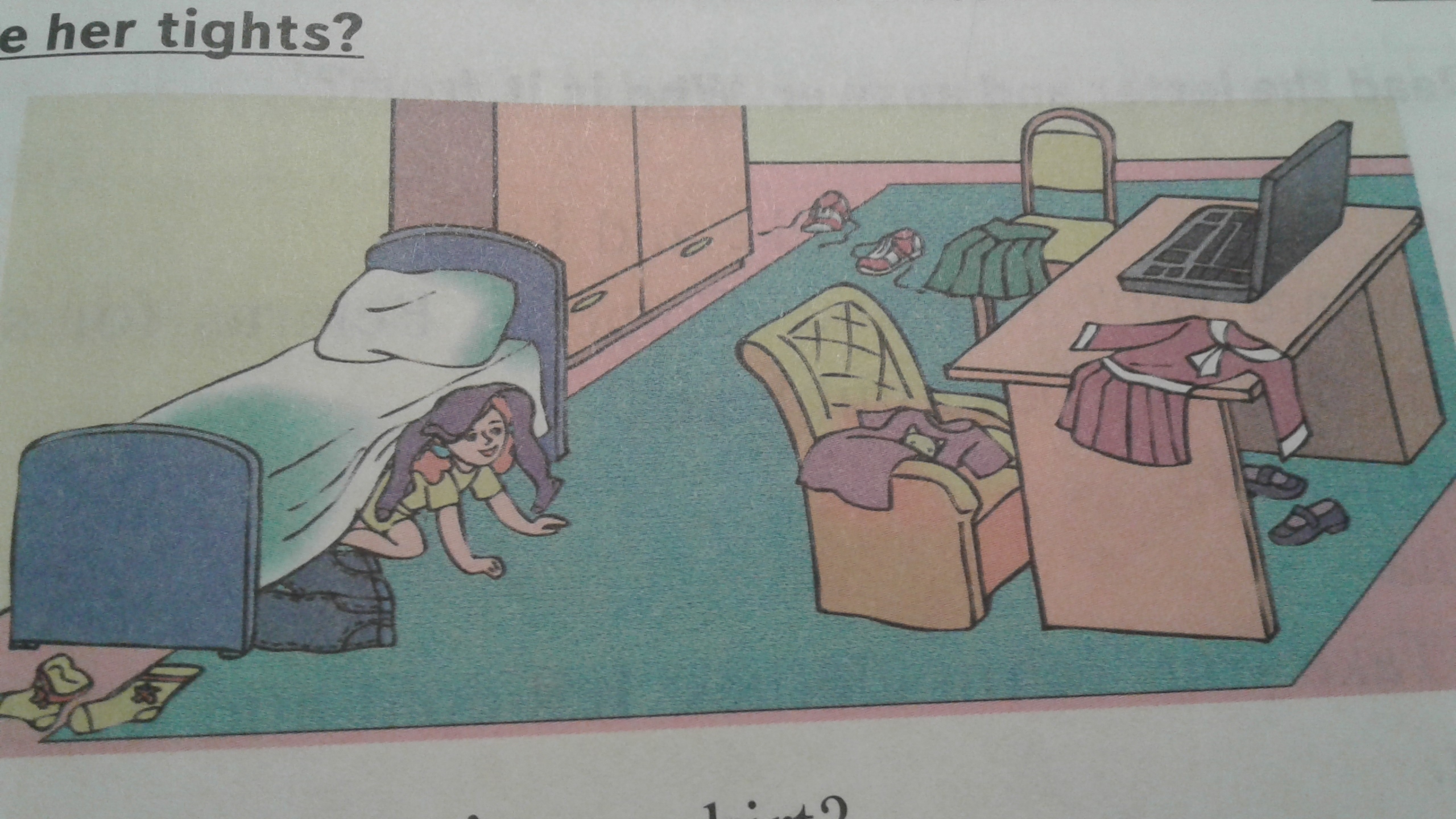 This room Ann.On the table is a computer and a dress. Shoes under the table.Next to the table is a chair and armchair.On the armchair is blouse and on the chair is skirt.Girl under the bad.Beside her tights, jeans and socks.