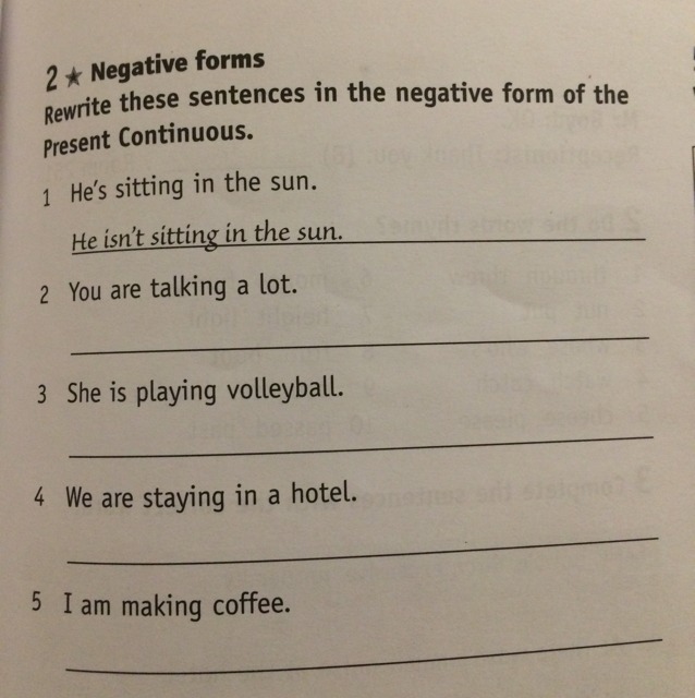 2 you aren't talking a lot 3 she isn't playing volleyball 4 we aren't staying in a hotel 5 i am not making coffee