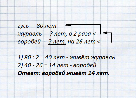 гусь живёт примерно 80 лет, журавль в 2 раза меньше чем гусь, а воробей на 26 лет меньше, чем журавль. сколько лет живёт воробей