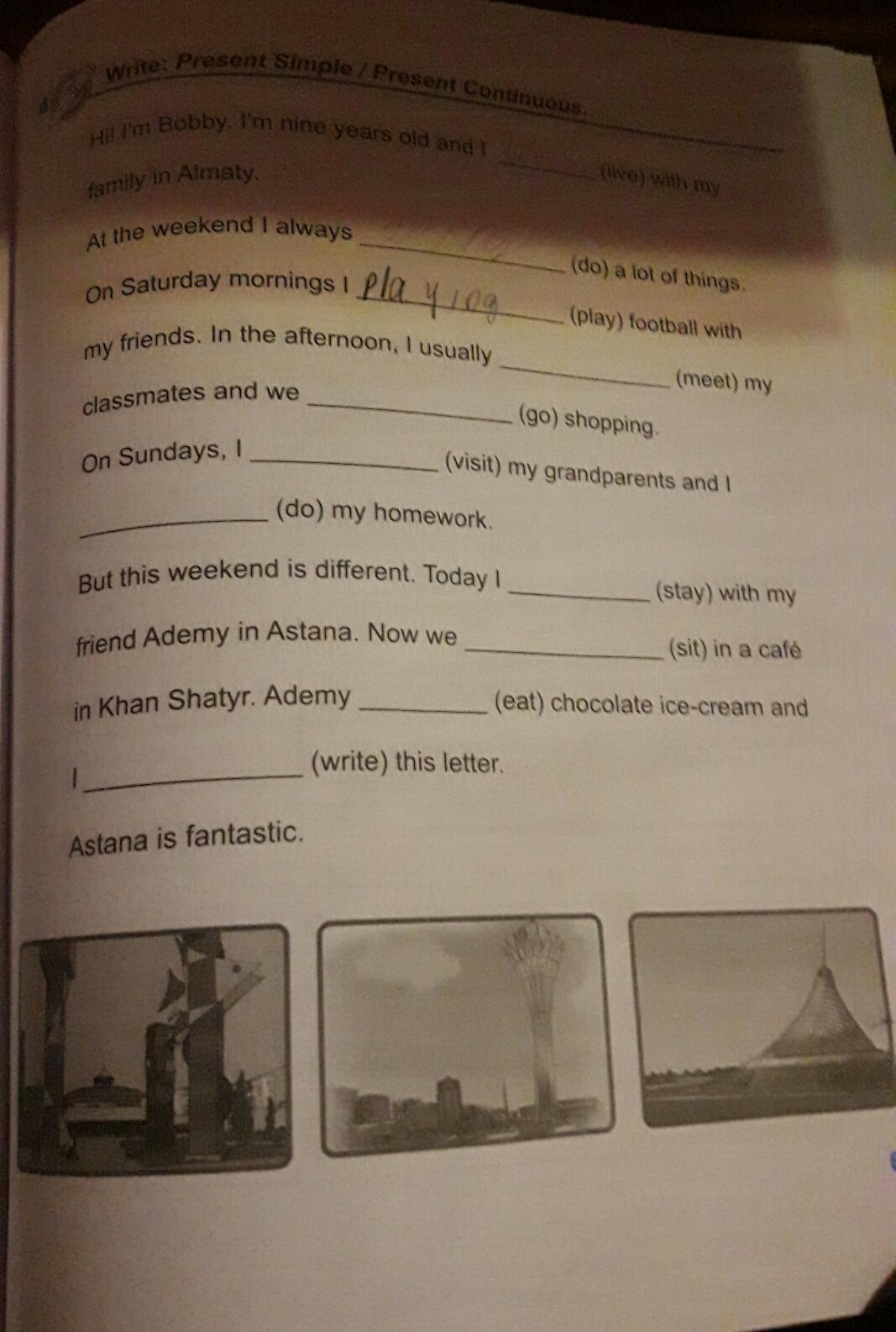 In the afternoon meet my classmate and we going to shopping. On Sundays,l visit my grandparents and I do my homework. But this weekend is different. Today I stay with my friend Adele in Astana.Now we siting in a cafe in......Adele eating.......I writing....