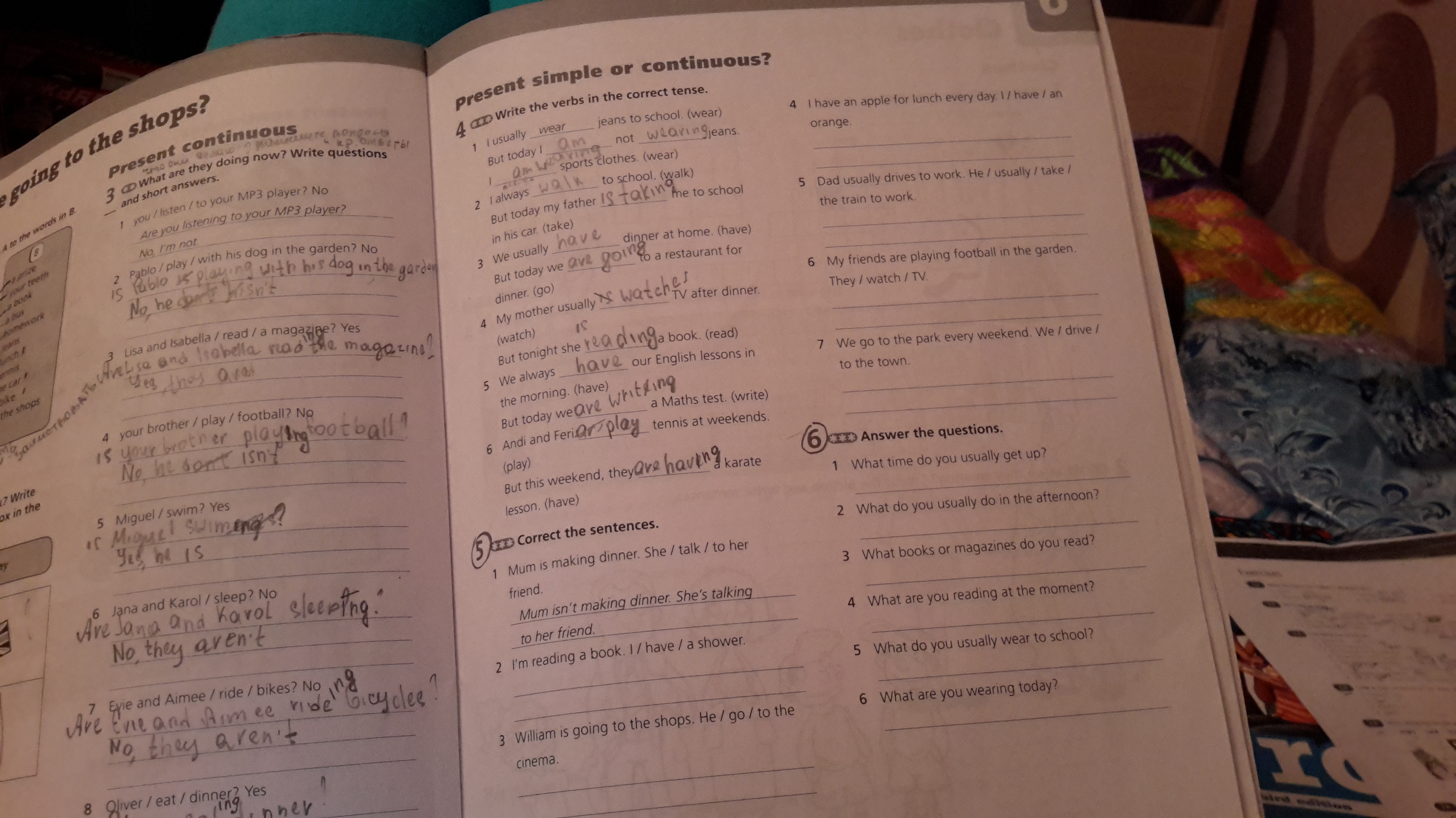 2) I'm not reading a book.I am having a shower.3) William isn't going to the shops. He's going to the cinema.4) I haven't got an apple for lunch every day. I I am having an orange5)Dad usually doesn't drive to the work.He usually takes the train to work6) my friends aren't playing football in the garden. They are watching TV7) we don't go to the park every weekend. We we drive to the town