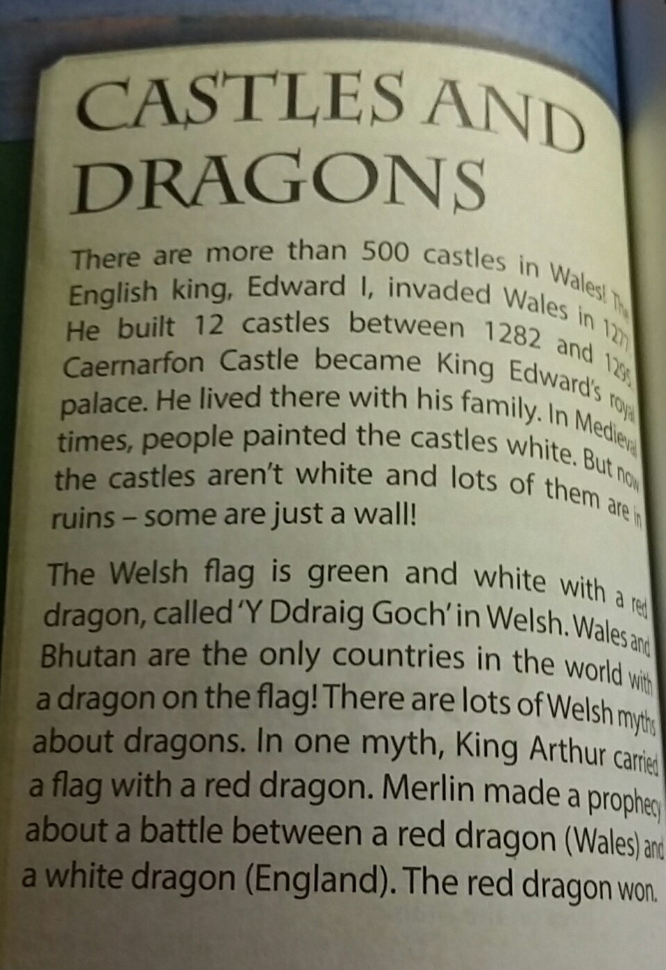 Крепости и DRAGONS Есть более чем 500 Замок в ш Английский король Эдуард I, вторгся построили 12 между и Карнарвон Замок стал королем дворец. Он жил там с его Amily. времена, люди окрашены замки йота замки не белые и многие из них руины некоторые из них просто стена! Валлийский флаг зеленый и белый с драконом, под названием 'YDdraig' в валлийском Уэльсе Бутан являются единственными странами в а на Есть много Welshmyon о драконах. В одном мифе, король Артур ча с красным драконом. Мерлин сделал prophen о битве между красным драконом (Уэльс белый дракон (Англия). Красный дракон выиграл