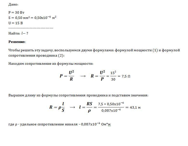 Реостаттың пайдаланатын қуаты 30 Вт,қысқыштарындағы кернеу 15 В. Егер көлденең қимасы 0.50мм2 болса,реостаттың дайындауға кететін никель сымының ұзындығын анықтаңдар.