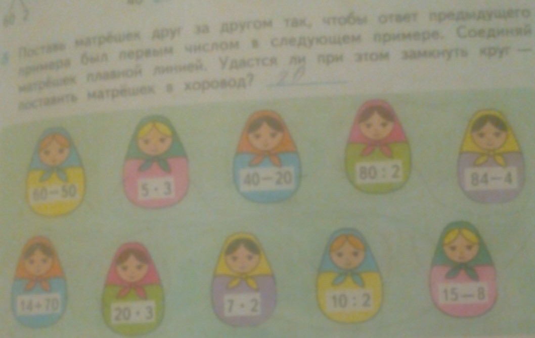 Я дала каждой матрешке порядковый номер, под каждым номером написала ответ примера.