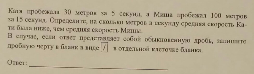 Ответ: средняя скорость Кати на 2/3 м/с ниже, чем скорость Миши