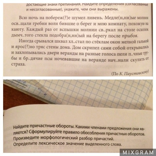 Всю ночь на побережье шумел ливень.Медленные молнии освещали(свет) гребни волн,БИВШИЕ О БЕРЕГ И МОЮ КОМНАТУ,похожую на каюту.Каждый от вспышки молнии сверкал(свет) на столе осколок дымчатого стекла ,Подобранный на берегу после прибоя(п.о)