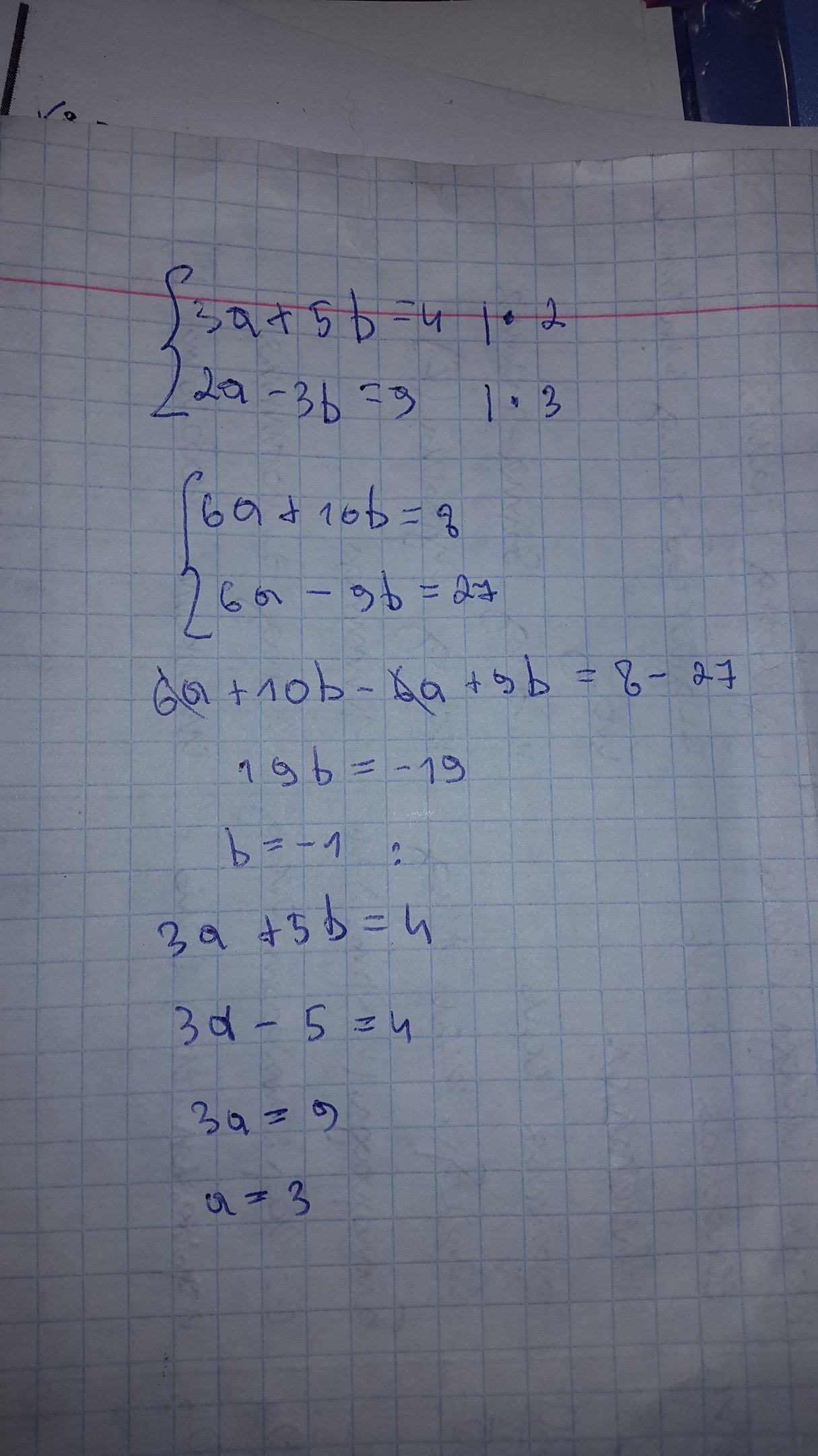 первое уравнение умножаем на 2:6a+10b=8;а второе умножаем на 3:6a-9b=27