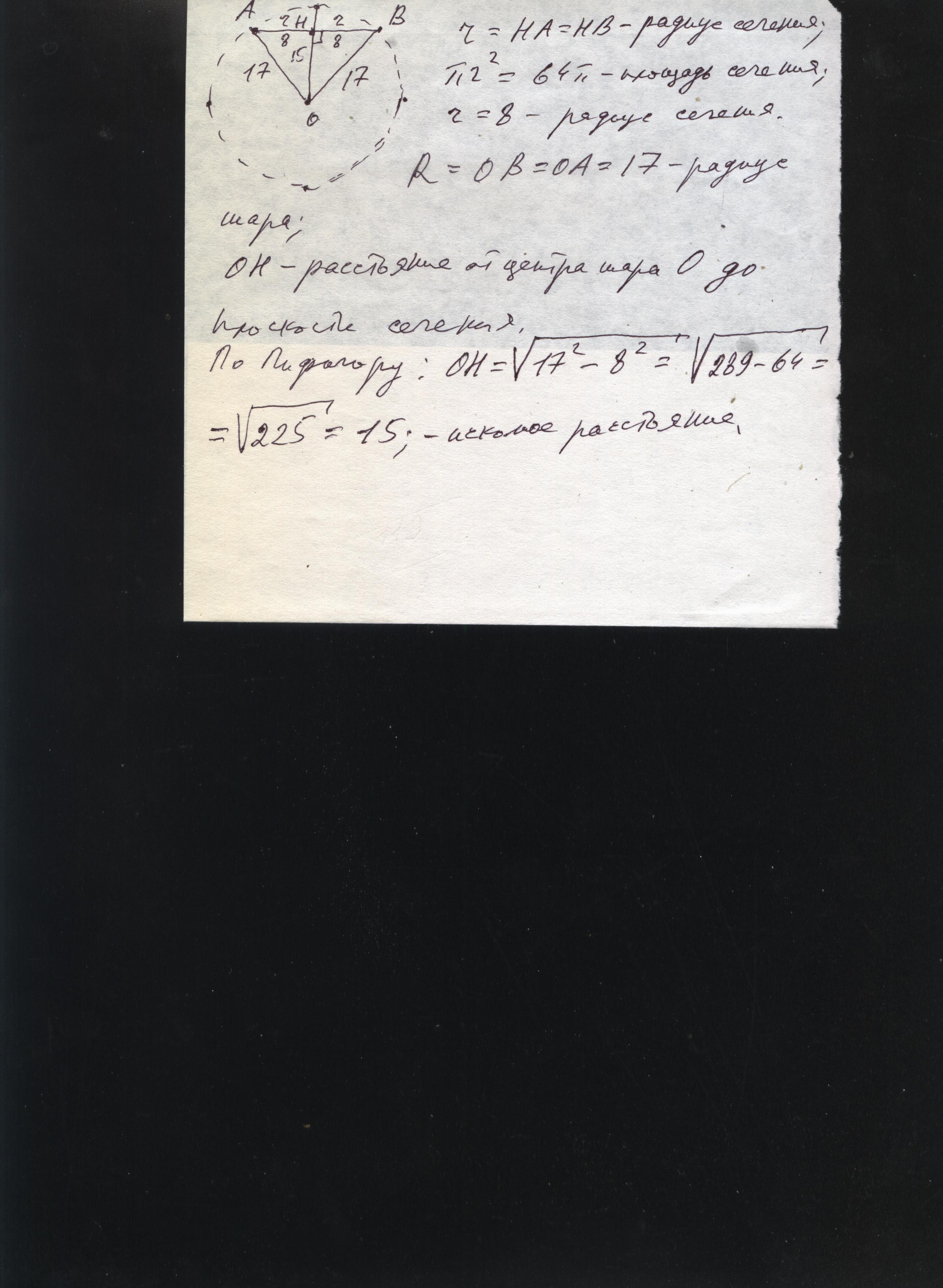 Площадь сечения шара плоскостью равна 64 П см^2 . Радиус шара-17 см. Вычислите расстояние от центра шара до плоскости сечения.