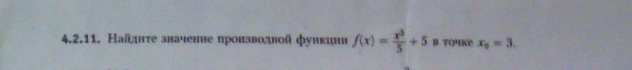 производная функции равна: (1/5)*3x^2. производная равна: (3/5)*x^2. производная константы равна 0. подставляем числовое значение: (3/5)*3^2=27/5=5,4.