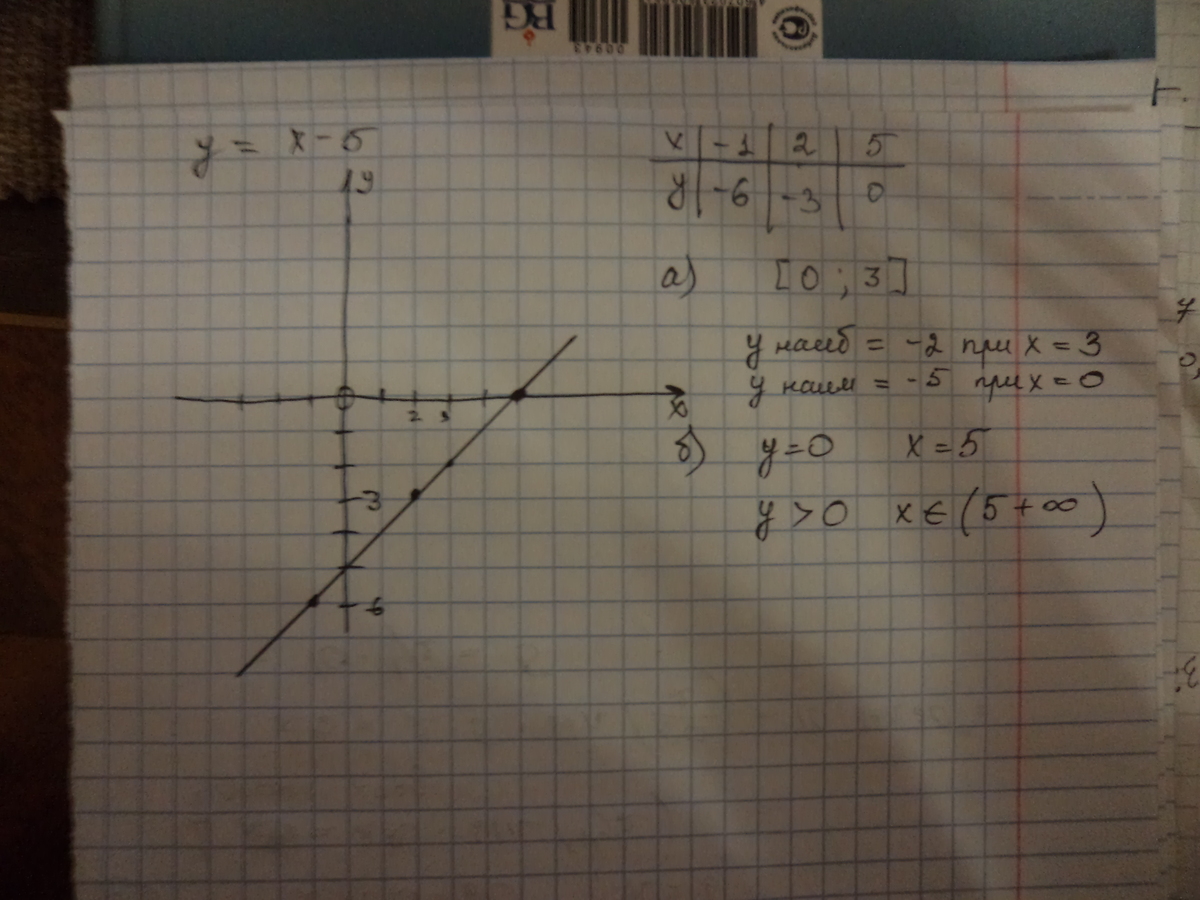 Постройте график функции у = х - 5. С помощью графика найдите: а) наибольшее и наименьшее значения функции на отрезке [0; 3]; б) значения переменной х, при которых у = 0; у > 0.