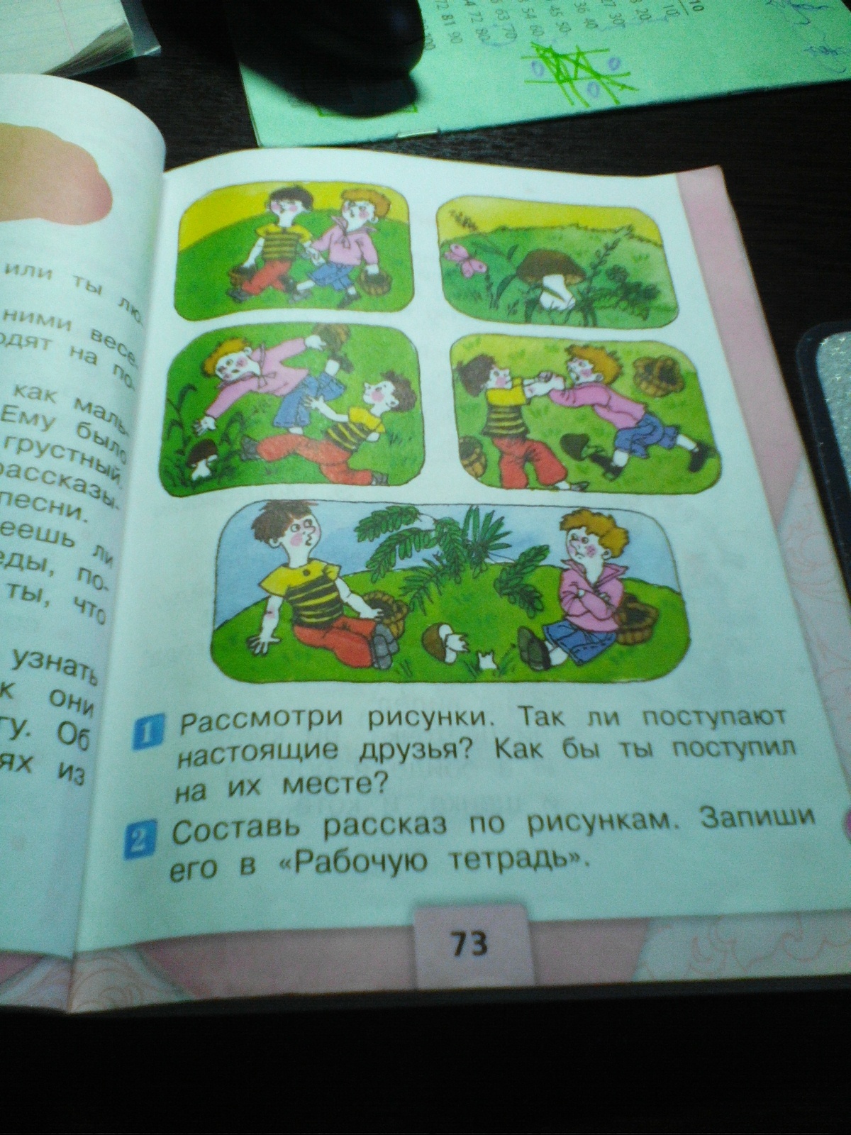 как то раз мальчик Андрей пошел в лес и увидел гриб. Неожиданно подбежал мальчик Леша он был приказчик.И ударил Андрея. Тут мальчики начали ссорится и отбирать грибы.Но потом помирились и поняли что так делать нельзя.И после этого они подружились и стали лучшие друзья.